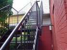 Escalier standard en acier avec marches en checker plate. Rampe à barreaux verticaux.