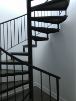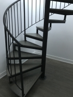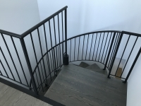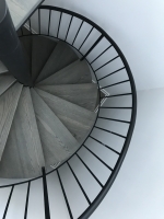 Escalier tournant en acier. Marches en bois Rampe en acier barreaux verticaux Peinture électrostatique Escalier dans un espace restraint