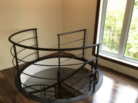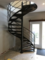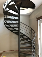 Escalier tournant en acier. Panneau acier perforé latéral Marches en bois Garde corps circulaire